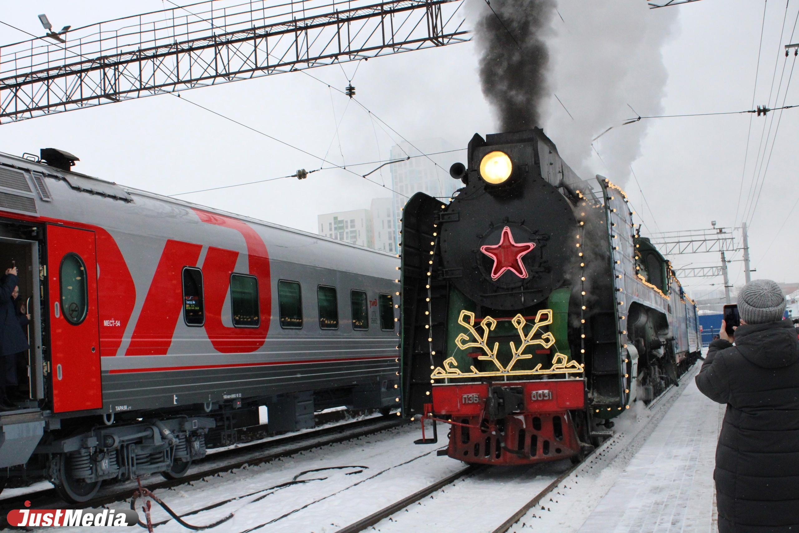 В эти выходные в Екатеринбург и другие города Свердловской области на шикарном поезде с настоящим паровозом приезжает Дед Мороз вместе с другими сказочными персонажами. Встретить их в уральской столице можно на Железнодорожном вокзале.