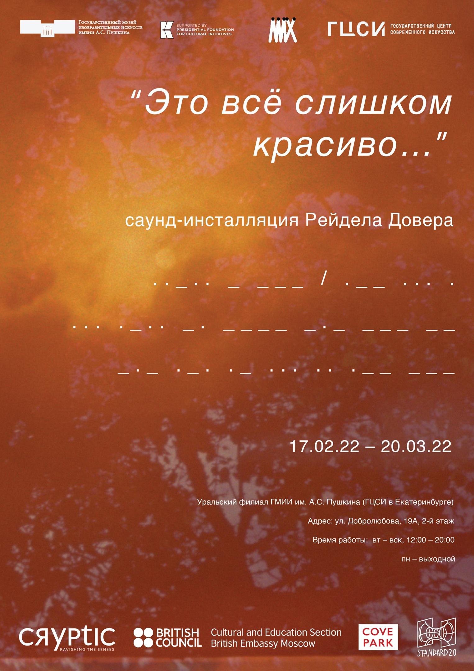 В ГЦСИ пройдет открытие инсталляции британского художника Рейдела Довера «Это все слишком красиво». Инсталляция будет состоять из трёх парящих метеорологических шаров, которые передают сообщения на кириллице с помощью азбуки Морзе через прикреплённые к ним динамики. Сообщения представляют собой тексты психоделических песен контркультуры 1960-х, переведённые на русский код Морзе.