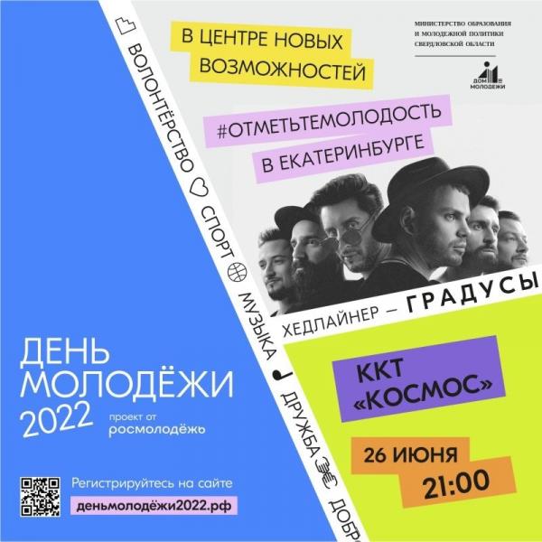 На площадках около ККТ «Космос» и Дворца игровых видов спорта развернется масштабное празднование Дня молодежи. Фестиваль включает несколько тематических зон: музыка, креатив, активный образ жизни, добро, просвещение, карьера, юмор, дружба и возможности. В финале выступит группа «Градусы». Поп-группа исполнит любимые хиты («Режиссёр», «Научиться бы не париться» «Хочется», «Кто ты?» и другие) на главной сцене фестиваля.