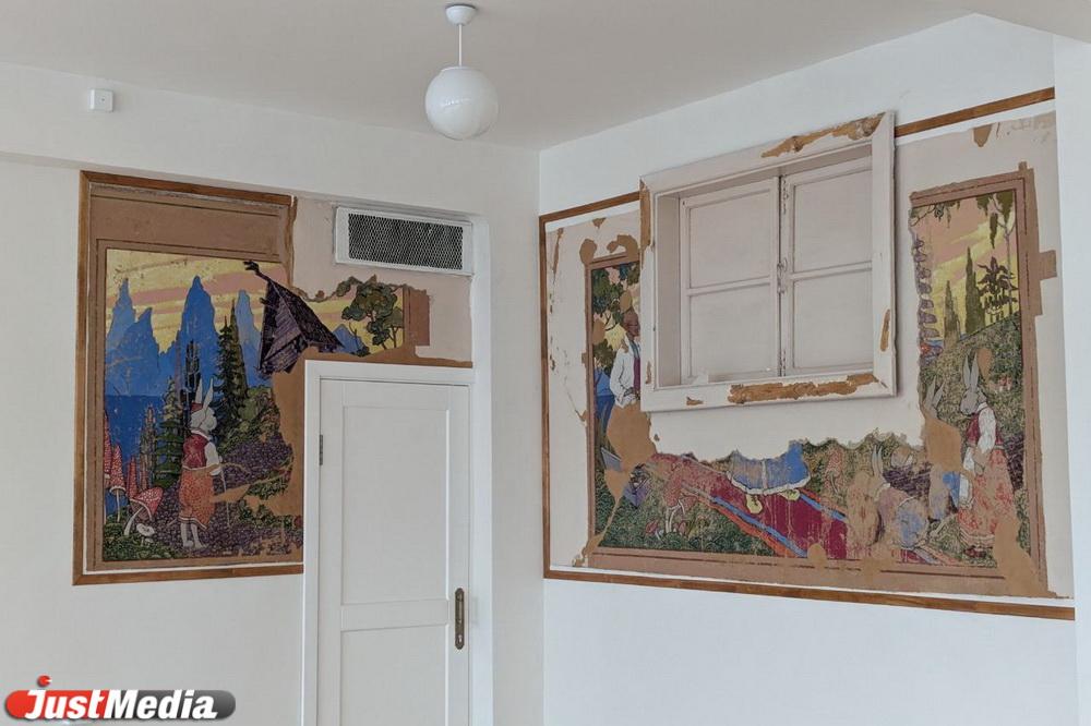 «Совершенно случайно мы нашли красочную мозаику в углу зала. Сотрудники музея сразу кинулись изучать, что же это такое. Выяснилось, что это полотно 1937 года за авторством двух художников из Свердловска. Это две картины, которые являются аллюзией на сказку «Доктор Айболит» за авторством Чуковского. Наличие таких иллюстраций обуславливается тем, что в то время двухцветный зал становится домом для детского медицинского учреждения. Скорее всего, изображений было намного больше, однако в процессе перестроек и ремонтов почти все было безвозвратно утрачено», - рассказал Игорь Пушкарев.