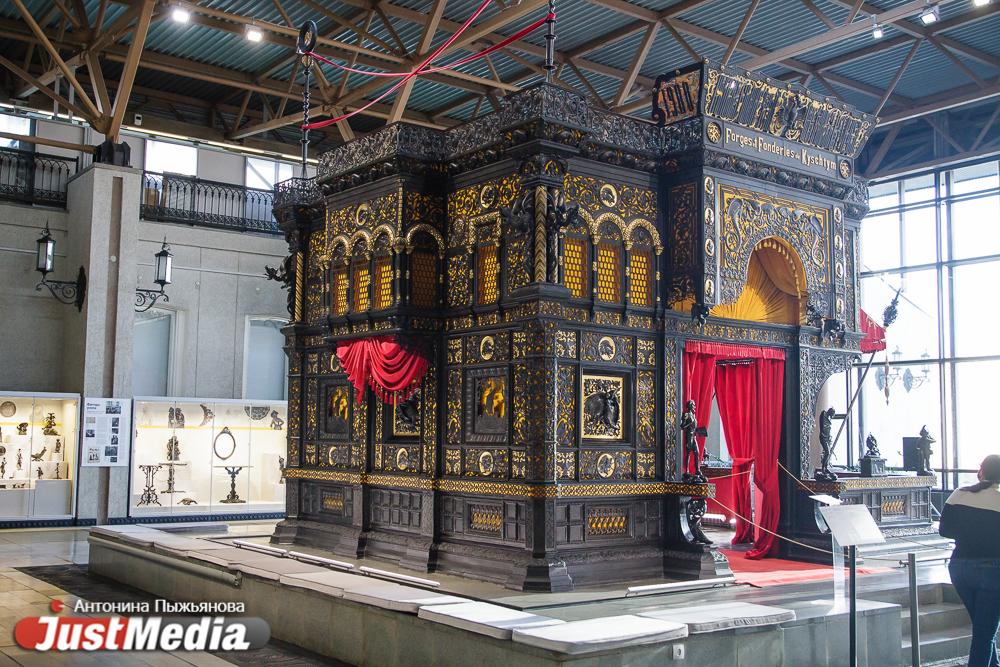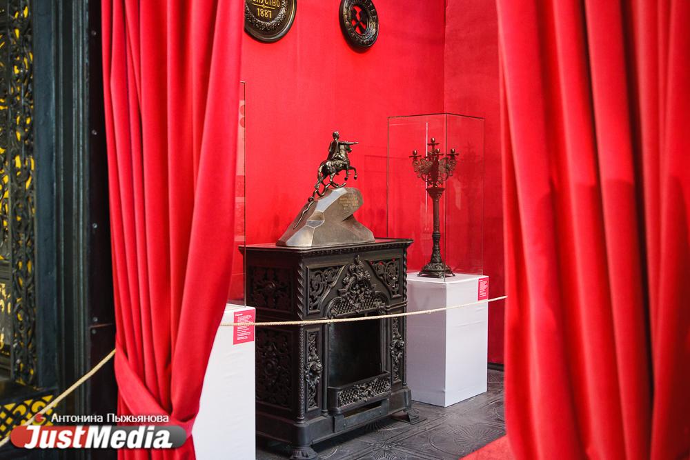 Провожатый сразу же повел нас внутрь Каслинского чугунного павильона, доступа в который еще совсем недавно не было. Посетители могли увидеть его только снаружи. Необычно смотреть на помещения музея из Каслинского павильона. Красная обивка повсюду как будто так и говорит тебе, что он был создан для того, чтобы поразить жюри на выставке в Париже.