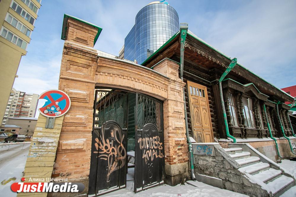На территорию дома Ваганова я попадаю благодаря архитектору-реставратору, старшему преподавателю УрГАХУ Ларисе Шашкиной и выпускнице вуза Елене Пашковой. Именно они открывают мне испорченные граффити ворота, и сразу же перед глазами возникает еще более удручающая картина – за красивым резным фасадом скрывается полная разруха. В доме выбито большинство окон, нет пола и внутренностей – чтобы не наткнуться на гвозди, торчащие из пола, мне заранее посоветовали надеть обувь на толстой подошве. Требование выполнено – идти дальше не страшно и не опасно.