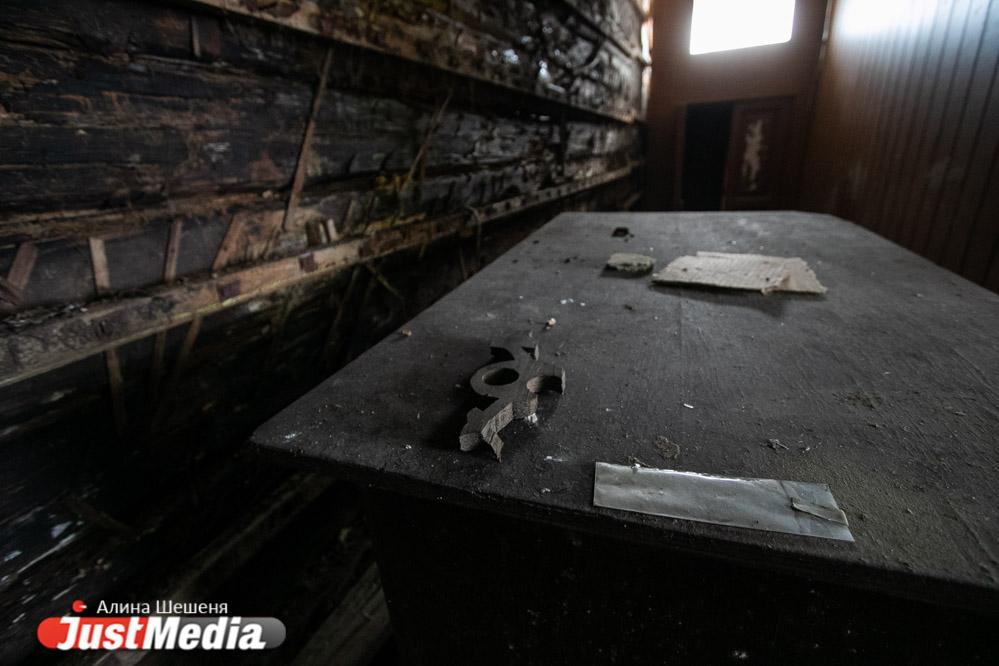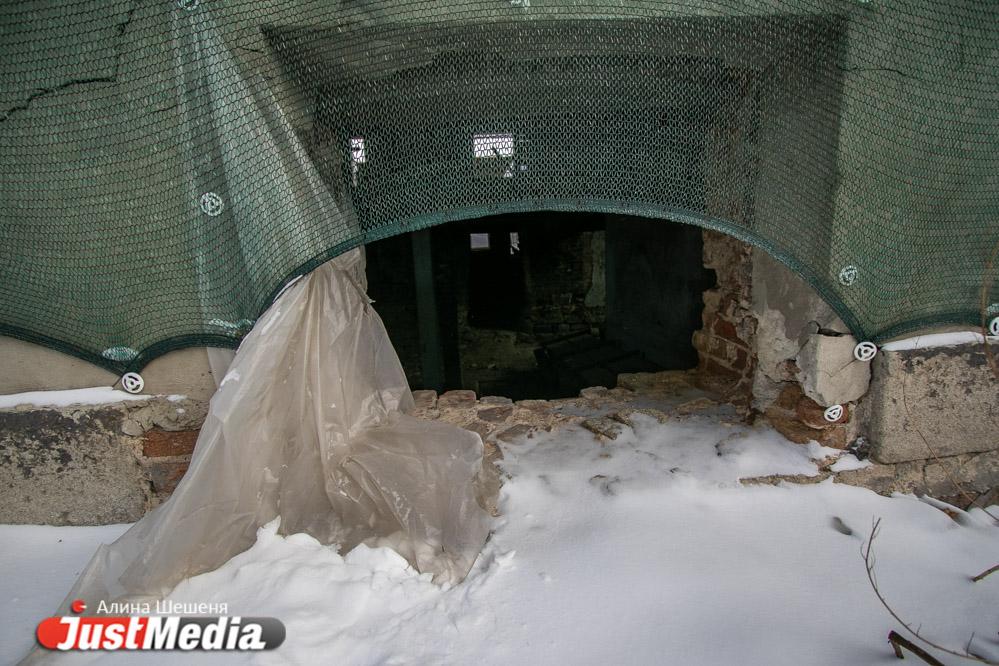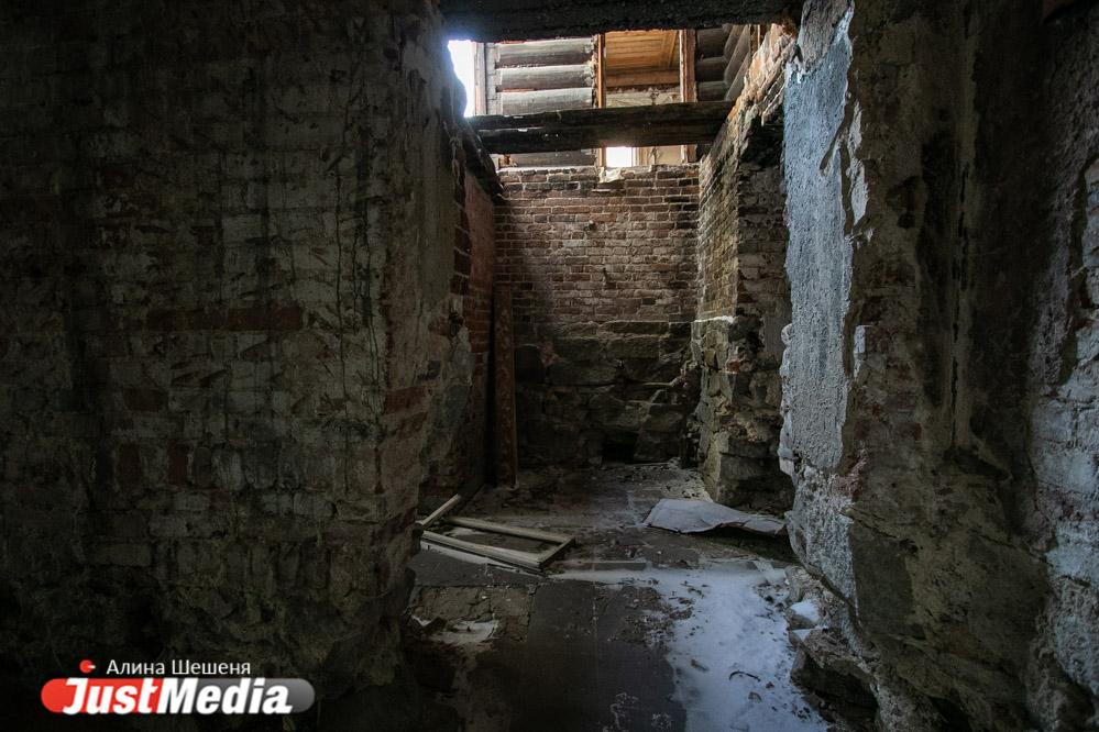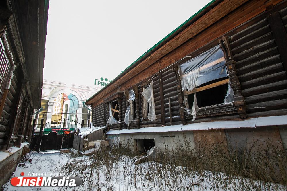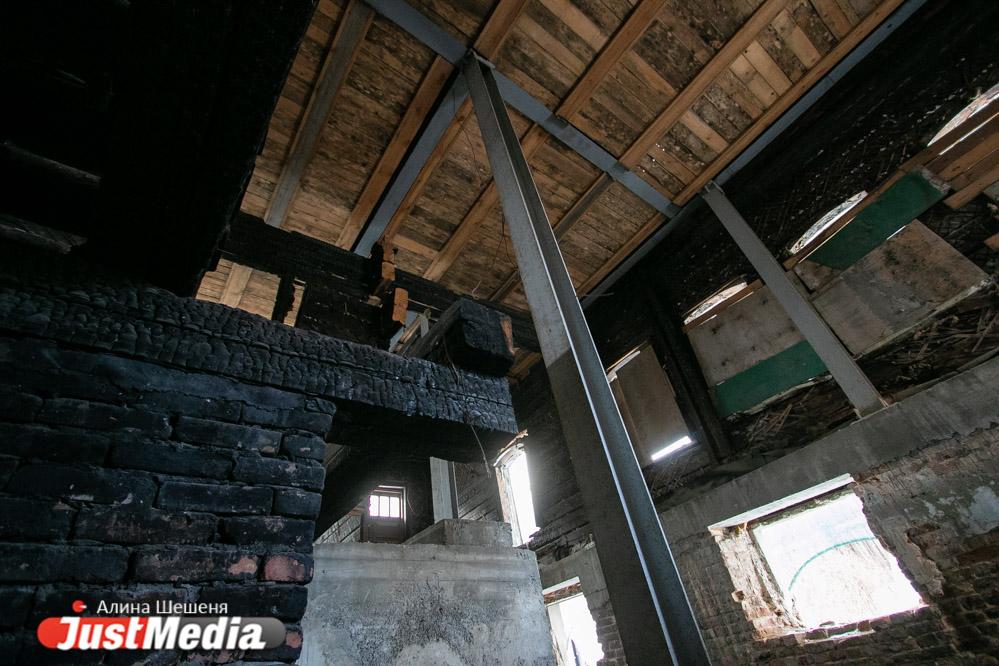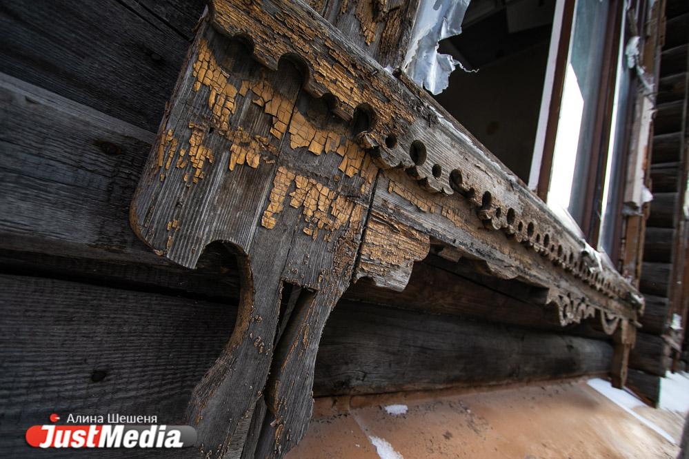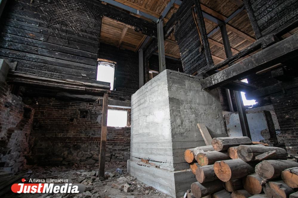 «В 2008 году во время реставрационных работ (тогда собственником числился «Монетный щебеночный завод», – прим. ред.) мы заложили окна, пробитые во времена коммунальной квартира, для соединения разрушающихся стен поставили железобетонный пояс, заменили крышу, по главному фасаду сделали реставрацию венцов, срубов, декора и вставили несколько окон», – объясняет Шашкина, осторожно переступая через обгоревшие бревна внутри разрушающегося здания.