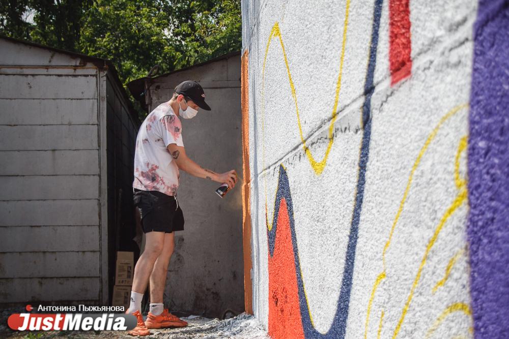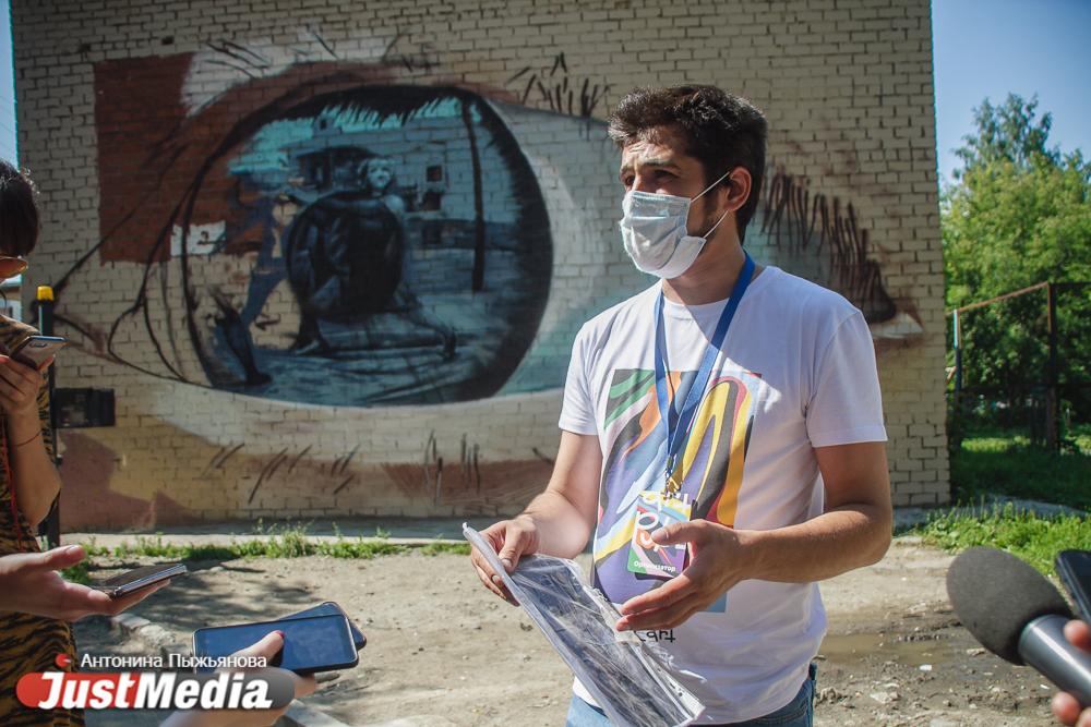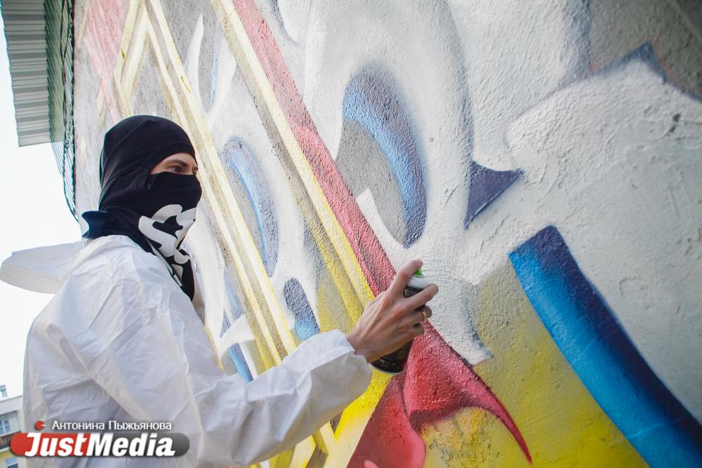 Еще одна работа фестиваля пока не закончена и находится возле Ленина, 53. Ее рисует екатеринбургский художник под псевдонимом Константин KOSS. Его лицо журналистам разглядеть не удалось. И в этом виновата не медицинская маска, которую сейчас все носят, чтобы защититься от коронавируса. Художник сам пожелал остаться неизвестным и закрыл свое лицо.