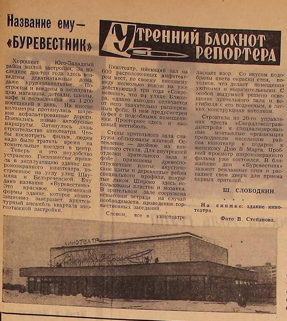 «5 марта 1970 года госкомиссия приняла в эксплуатацию здание широкоформатного кинотеатра «Буревестник». Это красивое современное здание, которое композиционно завершает архитектурный ансамбль квартала многоэтажной застройки. Кинотеатр, имеющий зал на 600 расположенных амфитеатром мест, по своему внешнему виду похож на уже действующий три года «Современник» на Блюхера. Однако выгодно отличается от него значительно расширенным фойе. В нем предусмотрен буфет с подсобными помещениями. Просторнее здесь и кассовый вестибюль. В зрительном зале сооружена невысокая эстрада на случай необходимости проведения торжественных заседаний. Пробный просмотр фильма уже состоялся. В ближайшие дни буревестник зажжет рекламные огни и распахнет свои двери для приема первых зрителей», — написал Ш. Слободкин в своем материале в «Вечернем Свердловске».