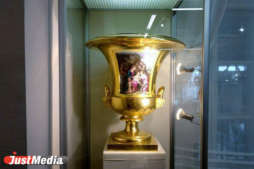 «Финальный аккорд экскурсии в нашем музее – это прекрасная ваза, на тулове которой репродуцирована картина итальянского художника XVI века Лавиния Фонтане. Но именно над этим экспонатом в первой четверти XIX века работал другой мастер – Матиас Адлер. Здесь мы видим фигуру святой Екатерины с короной на голове, которая опирается на деталь сломанного колеса с шипами»,- объяснила научный сотрудник сектора экскурсионного сервиса екатеринбургского музея изобразительных искусств Анна Решетникова.