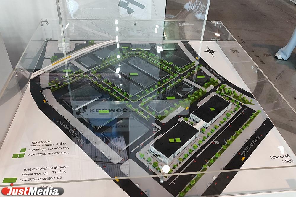 Вся механика отключена в «нулевой» день. Оценить работу агрегатов можно будет только с открытием выставки в понедельник, 7 июля. Зато ничего не мешает осмотреть макет экосистемы «Космос», включающей себя индустриальный и технопарк. Объекты общей площадью 16 гектаров планируется построить рядом с «Екатеринбург-ЭКСПО». Проект утвержден, а работы по нему уже начались.