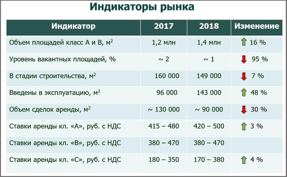 По итогам последнего года ставки на офисы класса «А» выросли на 1% до уровня 1280 рублей за кв. метр. В других классах, напротив, произошло небольшое падение. В «В+» этот показатель снизился на 3,3% до 890 рублей за «квадрат» (включая операционные расходы). Офисы класса «В» опустились в цене на 1,3% до уровня 740 рублей за кв. метр. «С»-класс предлагается сегодня по 474 рубля за «квадрат».