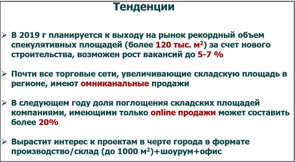 Ставки в сегменте складской недвижимости, в отличие от торговой и офисной, растут. Наибольший рост отмечает в сегменте качественных складов, расположенных в черте города. Это связано в том числе с тем, что многие арендаторы таких объектов развивают направление самовывоза товара для своих потребителей. По прогнозам Виталия Хиля, в следующем году компании, которые занимаются онлайн-продажами займут не менее 20% складских помещений.