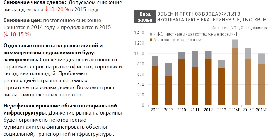 По словам президента Уральской палаты недвижимости Татьяны Деменок, до августа 2015 года ничего катастрофического ожидать не стоит. Предпосылок для повторения ситуации 2008 года нет. Заморозки объектов ожидать не стоит. У застройщиков имеется значительный финансовый запас, который позволит им сдать в этом году 1 млн. кв. метров, и эти площади будут востребованы. По данным Росреестра, всплеска продажи квартир, который был в мае-начале июня, на рынке нет. Но сегодняшнее затишье не настолько серьезное, чтобы говорить о том, что продажи встали.