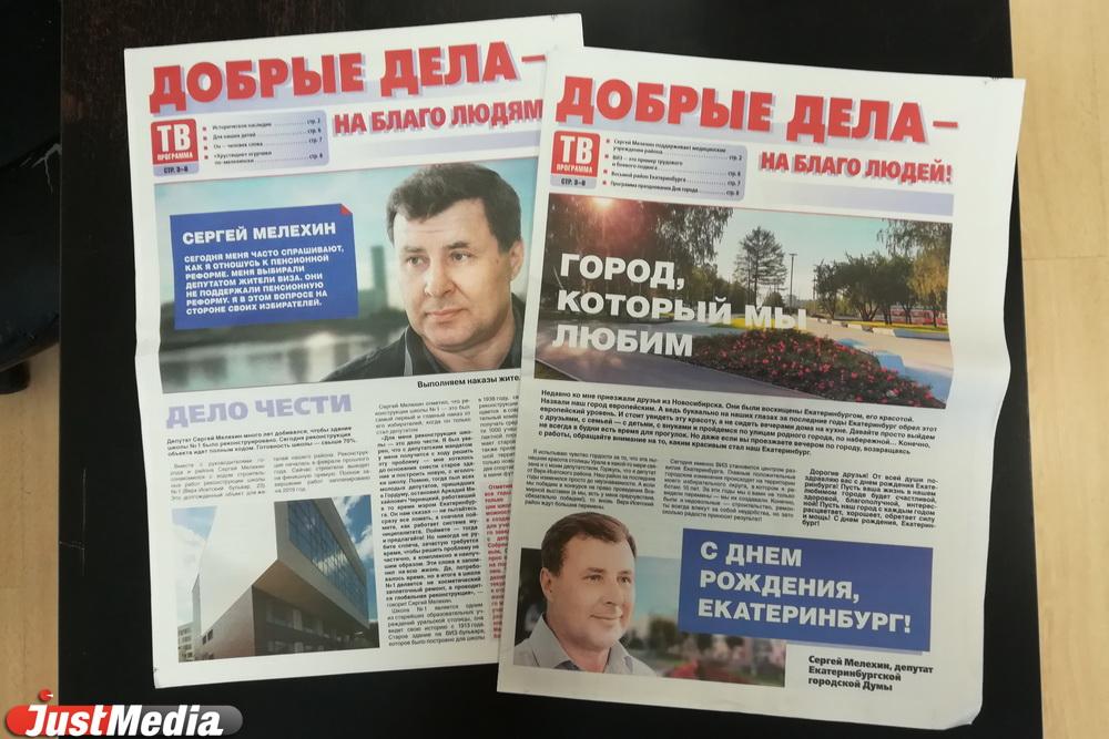 Действующий депутат от партии власти в ЕГД Сергей Мелехин богато агитирует предвыборной газетой. Материалы в ней – сплошной позитив, немного критики пенсионной реформы, никакого намека на партийную принадлежность, а для целевой аудитории кандидата – практически атавизм: программа телепередач.