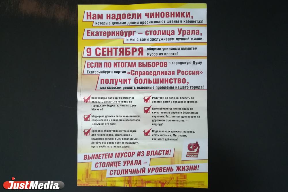 До выборов депутатов Екатеринбургской гордумы остается три недели. И количество агитационного материала растет в геометрической прогрессии. По-прежнему, активнее всего за себя агитируют кандидаты от «Справедливой России». В Екатеринбурге нет, пожалуй, ни одного подъезда, на котором не висело, пусть и недолго, лицо какого-нибудь эсера. Второе место по количеству агитации занимает «Единая Россия». Ненавязчиво за себя агитируют коммунисты и «Партия пенсионеров». Скромнее всего на этих выборах ведет себя ЛДПР.