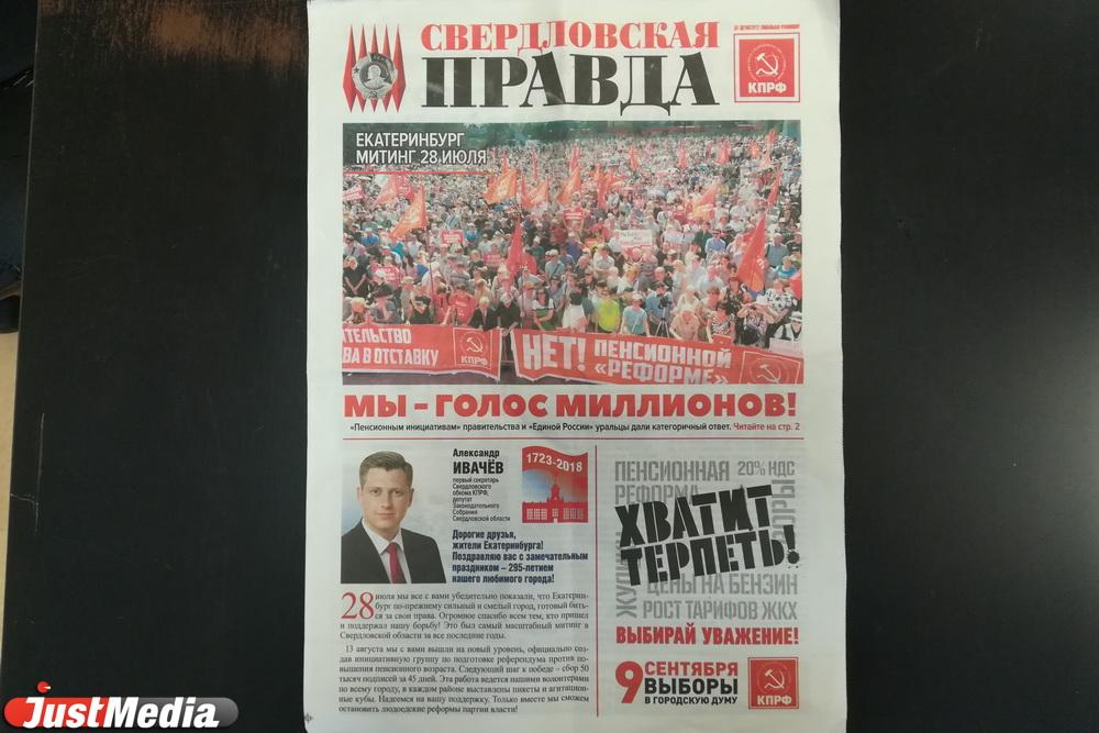 «Единая Россия» распространяет второй выпуск газеты «Время для главного», на обложке которой отдает честь не известный избирателям Герой России Сергей Воронин в форме полицейского. Содержимое газеты также вызывает недоумение: опять никакой партийной символики, заголовки нарочито нарушают правила русского языка (в них отсутствуют знаки переноса). А некоторые из них и вовсе повергают в ступор: «Почему Екатеринбург не умер?» Действительно, почему?