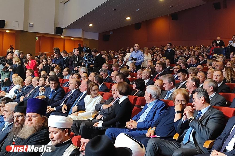 Вообще, зал набит «випами»: представителями исполнительной и законодательных властей, главами муниципалитетов, а также предпринимателями и деятелями культуры. Среди чиновников мы видим полпреда президента в УрФО Артема Жогу, председателя областного Заксобрания Людмилу Бабушкину, председателя свердловского Избиркома Елену Клименко, сенаторов Совфеда Виктора Шептия и Александра Высокинского, министров областного правительства, депутатов Госдумы и Заксобрания. Из других интересных персон – бизнесмены Артем Биков, активы которого путается национализировать Генпрокуратура, и Виктор Вексельберг, бывший начальник Дениса Паслера.