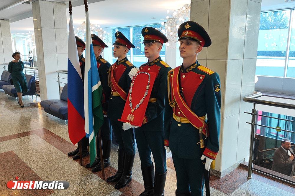Далее пять солдат вносят в зал флаги России и Свердловской области, а также знак губернатора. Он выполнен в виде цепи с 33 звеньями, в каждом из которых запечатлены символы региона. Выгравированы Данила-мастер из сказов Бажова, танк Т-34, символ атома и другие изображения. Артефакт сложно назвать реликвией, потому что его изготовили относительно недавно: в 1997 году.