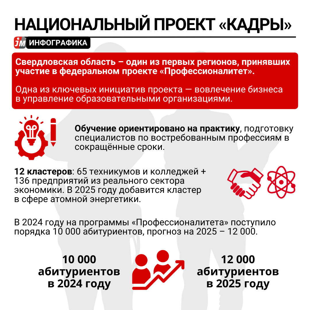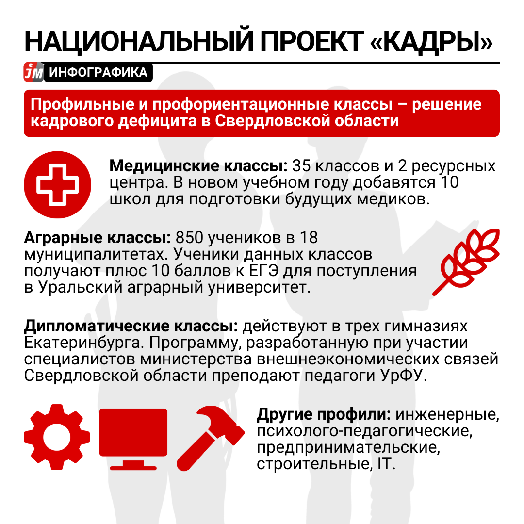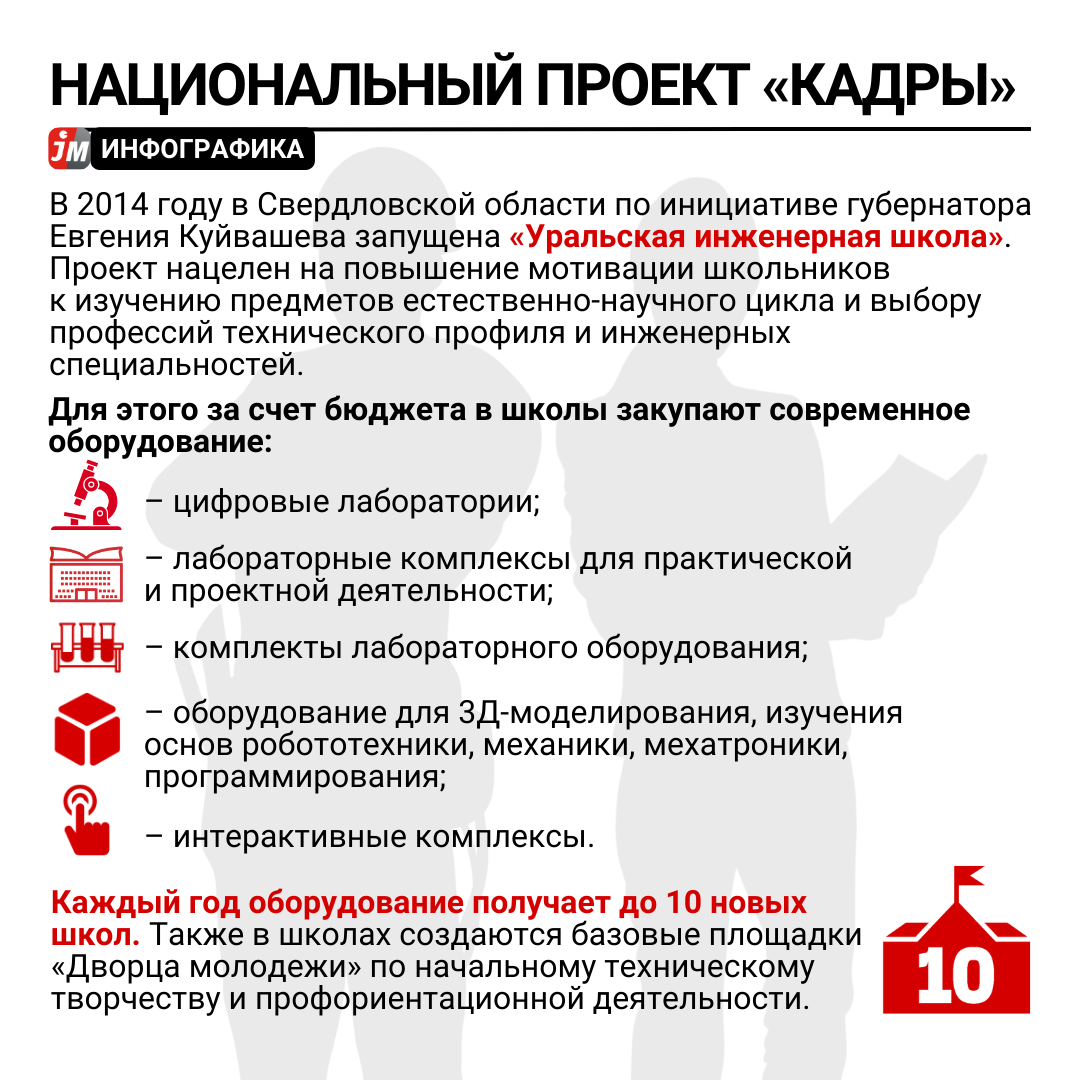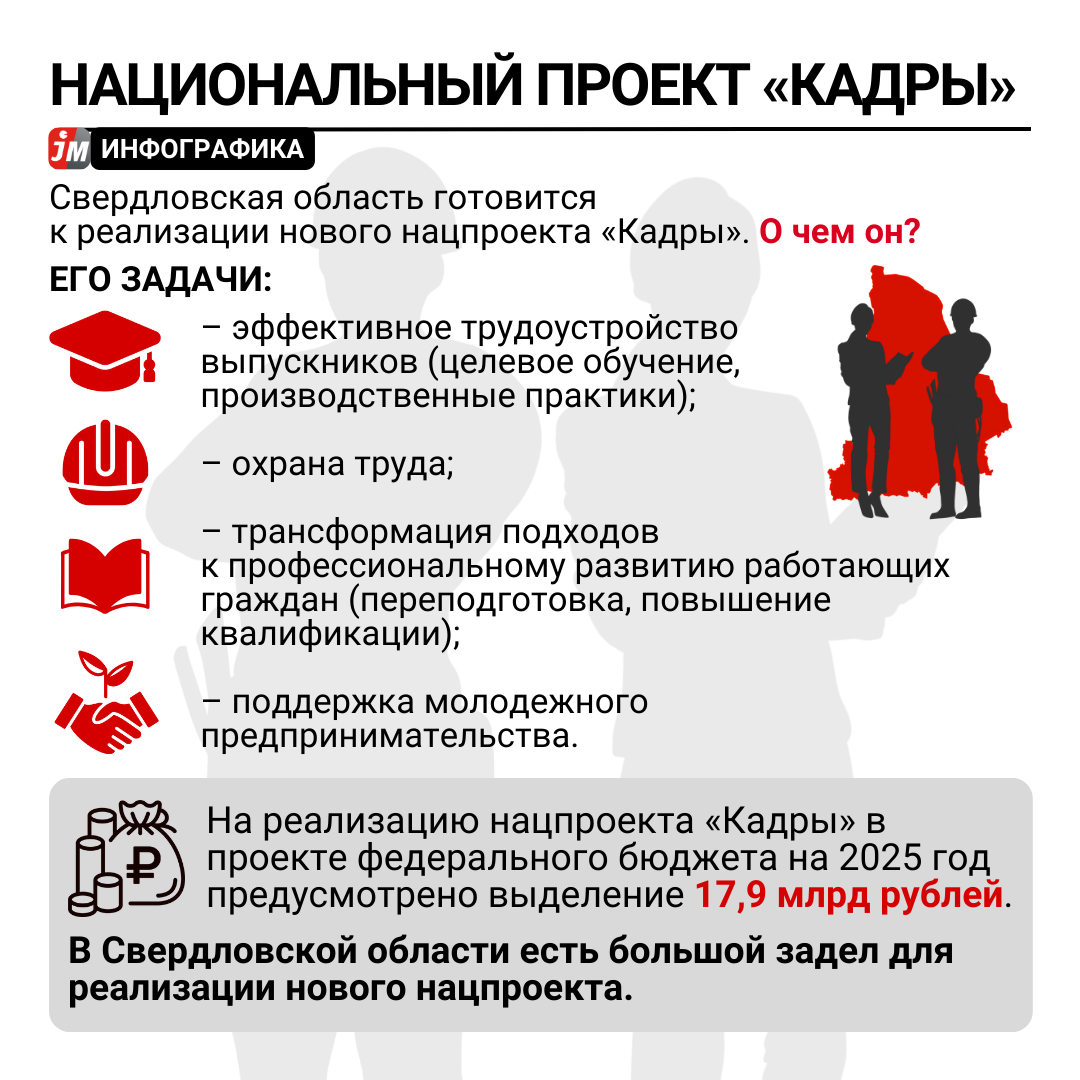 О том, какой задел для реализации нацпроекта «Кадры» уже есть в Свердловской области, и какие мероприятия запланированы в будущем, мы расскажем в этой статье. А краткая информация – в наших карточках.