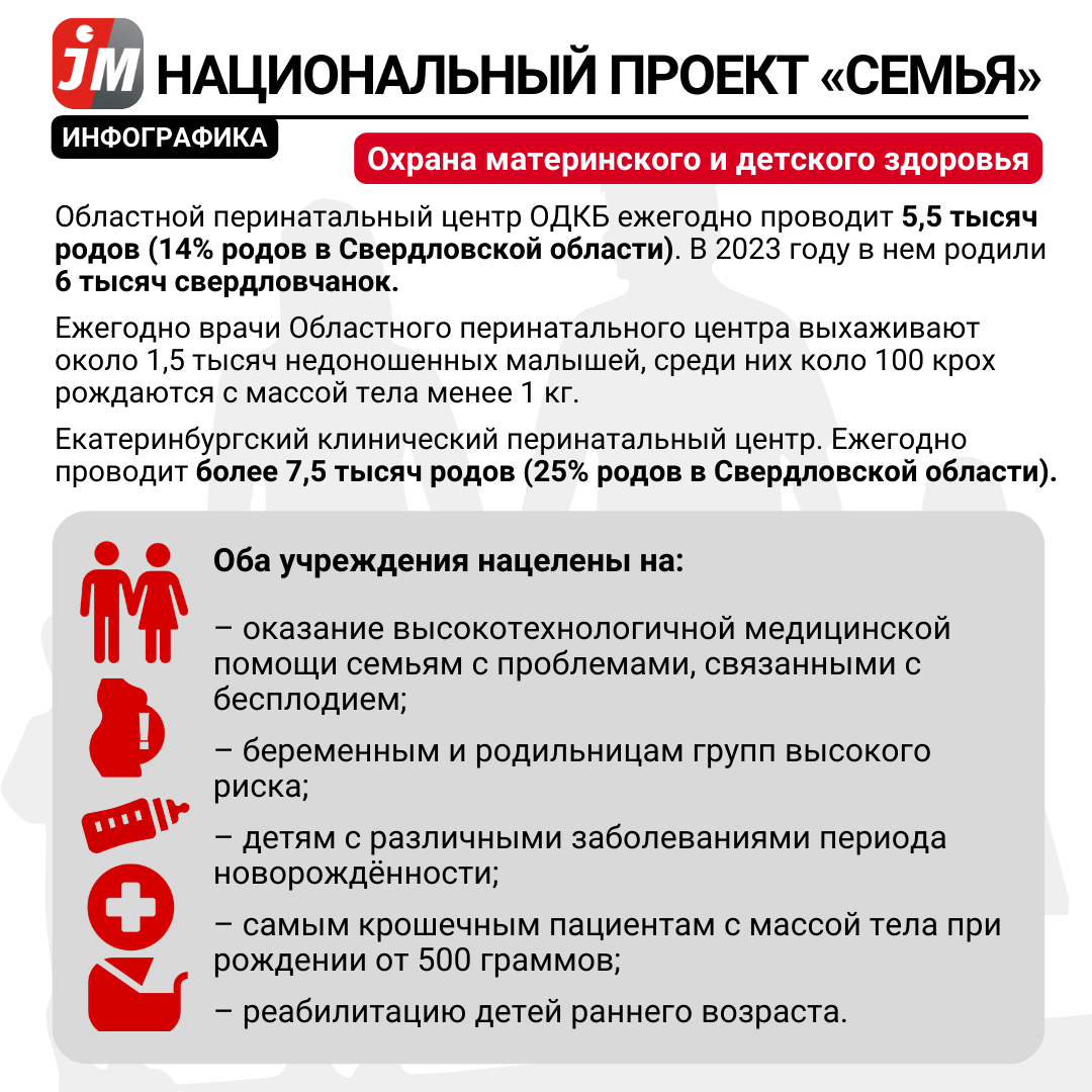 В Свердловской области главный ответственный за здоровье будущих мам и малышей – Областной перинатальный центр Детской областной клинической больницы. Это крупнейшее учреждение родовспоможения Свердловской области. Ежегодно здесь проходит около 5,5 тысячи родов — 14% от всех родов Свердловской области, причём 98% пациенток составляют женщины высокой и средней группы перинатального риска. В прошлом году перинатальный центр поставил рекорд – в нем родилось около 6 тысяч детей. А 25 пациенток стали мамами в седьмой и более раз, при этом у одной мамочки родился 12-й ребенок. Такая динамика полностью соответствует параметрам нацпроекта «Семья».
