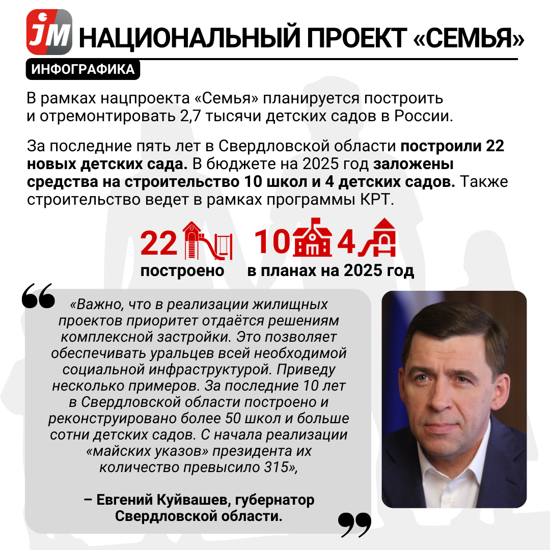 «Важно, что в реализации жилищных проектов приоритет отдаётся решениям комплексной застройки. Это позволяет обеспечивать уральцев всей необходимой социальной инфраструктурой. Приведу несколько примеров. За последние 10 лет в Свердловской области построено и реконструировано более 50 школ и больше сотни детских садов. С начала реализации «майских указов» президента их количество превысило 315».