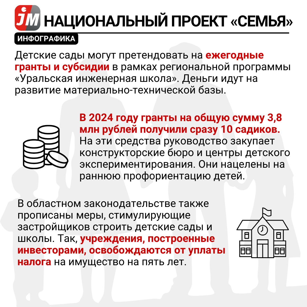 Помимо этого, уже существующие детские сады могут претендовать на ежегодные гранты и субсидии в рамках региональной программы «Уральская инженерная школа». Деньги идут на развитие материально-технической базы. В 2024 году гранты на общую сумму 3,8 млн рублей получили сразу 10 садиков. На эти средства руководство закупает конструкторские бюро и центры детского экспериментирования. Они нацелены на раннюю профориентацию детей.