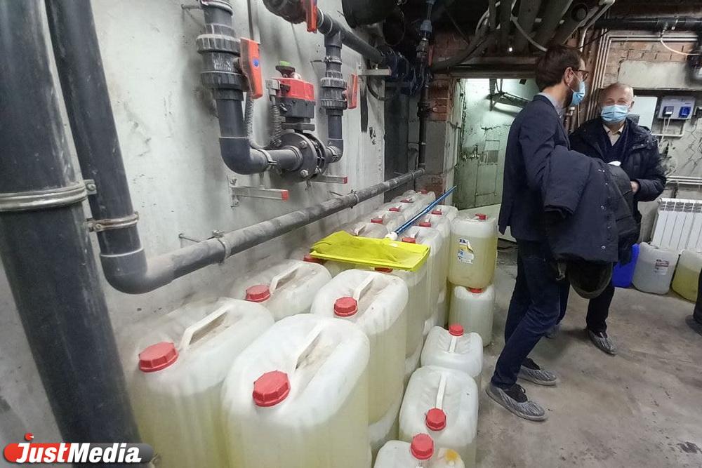 Делегация из депутатов и общественников направляется в подвал, где на стенах закреплены трубы, на полу стоят цистерны с растворами. Среди этой картины технический директор Андрей Рощиц вещает о самом «сердце» термального комплекса, его технической части: