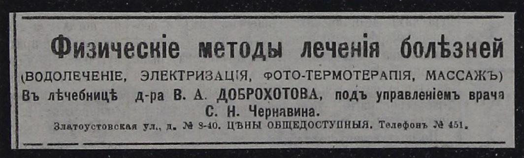«Физические методы лечения болезней (водолечение, электризация, фото-терапия, массажъ) в лечебнице доктора Доброхотова под управлением врача С.Н. Чернавина. Златоустовская № 8-10. Цены общедоступные. Телефон 451», - говорилось в рекламе заведения в газете «Уральский край» от 27 мая 1909 года.