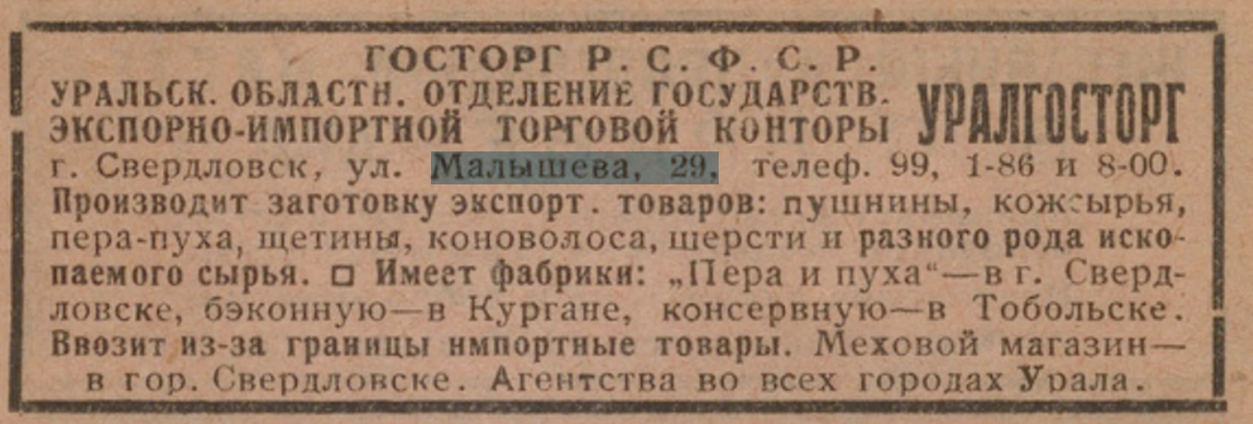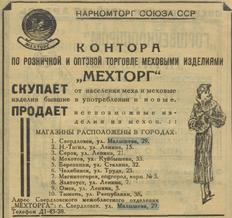«Контора по розничной и оптовой торговле меховыми изделиями «Мехторг», скупает от населения меха и меховые изделия бывшие в употреблении и новые. Продает всевозможные изделия из мехов. Магазин на Малышева 29», - говорится в рекламе «Мехторга» в 1941 году.