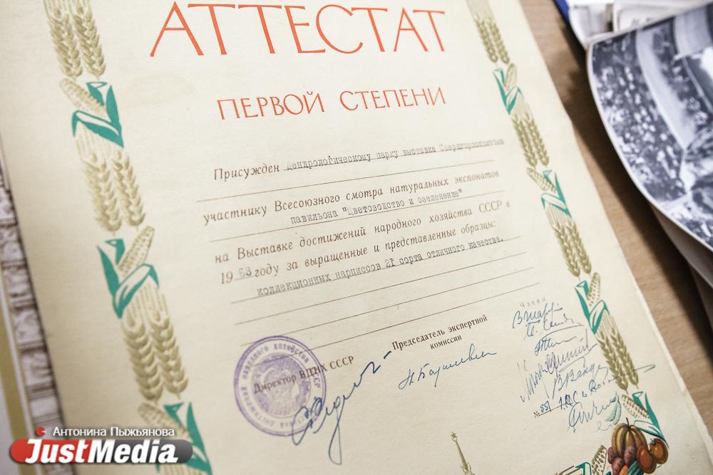 «Аттестат первой степени присужден Дендрологическому парку-выставке Свердгорисполкома – участнику Всесоюзного смотра натуральных экспонатов павильона «Цветоводство и озеленение» на Выставке достижений народного хозяйства СССР в 1963 году за выращенные и представленные образцы коллекционных нарциссов 21 сорта отличного качества», - говорится в аттестате, подписанном директором ВДНХ, председателем экспертной комиссии.