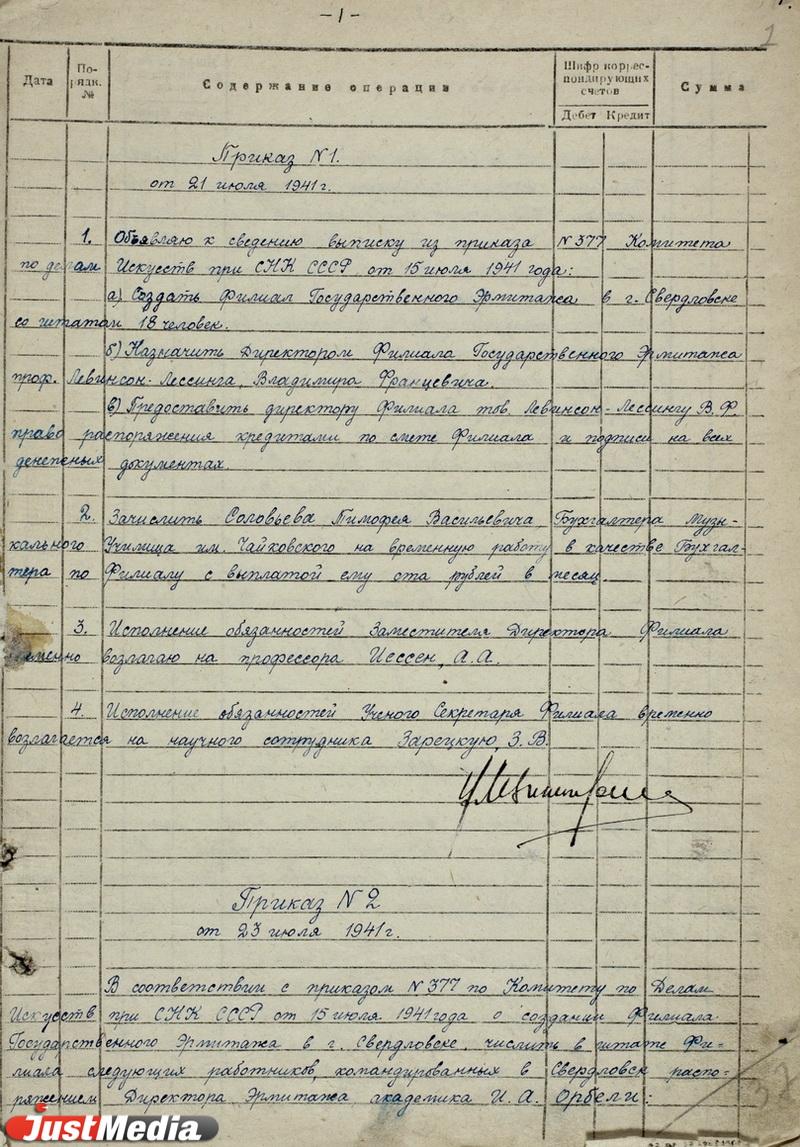 15 июля 1941 года Комитет по делам искусств при СНК СССР подписывает приказ №377, согласно которому в Свердловске создается филиал государственного Эрмитажа со штатом 18 человек. Руководителем филиала был назначен профессор Владимир Левинсон-Лессинг.