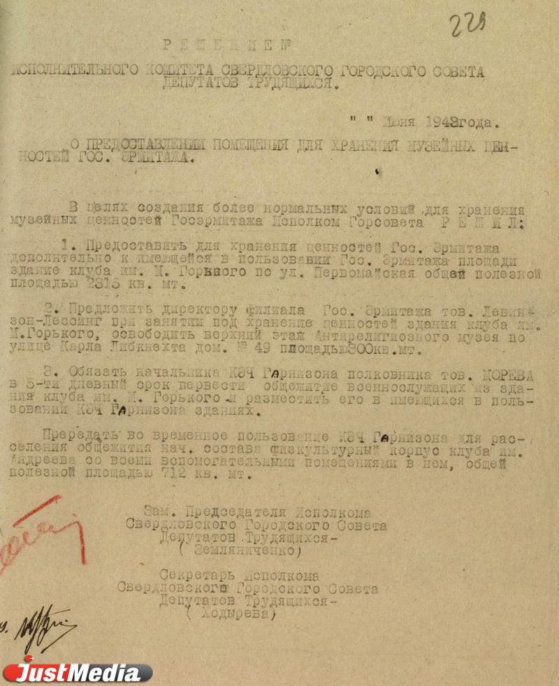 «В целях создания более комфортных условий для хранения музейных ценностей Госэрмитажа исполком горсовета решил: во-первых, предоставить в пользование музею площади здания клуба имени Горького. Во-вторых, предложить директору филиала Гос. Эрмитажа товарищу Левинсон-Лессингу при занятии под хранение ценностей здания клуба освободить верхний этаж Антирелигиозного музея по улице Карла-Либкнехта, 49 площадью 300 кв. метров. В-третьих, обязать начальника КЭЧ Гарнизона полковника товарища Морева в пятидневный срок перевести общежитие военнослужащих из здания клуба и разместить его в имеющихся в пользовании КЭЧ Гарнизона зданиях. Передать во временное пользование последнему физкультурный корпус клуба имени Андреева со всеми вспомогательными помещениями в нем, с полезной площадью 712 кв. метров», - говорится в июньском решении исполнительного комитета Свердловского городского совета депутатов трудящихся от 1943 года, которое хранится в Свердловском госархиве.