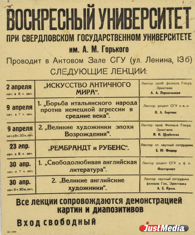 | Афиша “Воскресный университет при Свердловском государственном университете им. А.М. Горького”. ФОТО: Государственный Эрмитаж, Санкт-Петербург. Предоставил: Свердловский госархив. |