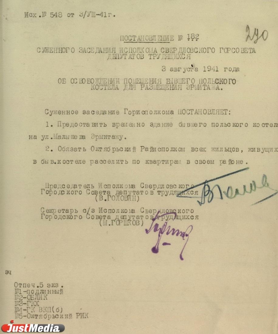 «Суженое заседание Горисполкома постановляет: предоставить временно здание бывшего польского костела на Малышева Эрмитажу, а также обязать Октябрьский Райисполком расселить всех жильцов, живущих в бывшем костеле, по квартирам своего района», - говорится в секретном постановлении №182 суженного заседания исполкома Свердловского Горсовета депутатов трудящихся от 3 августа 1941 года, которое хранится в Свердловском госархиве.