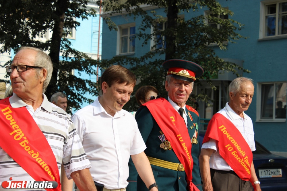 Праздничное шествие трогается с места. По традиции впереди карнавальной колонны идут представители администрации городского округа Богданович во главе с мэром Владимиром Москвиным, ветераны и почетные жители.