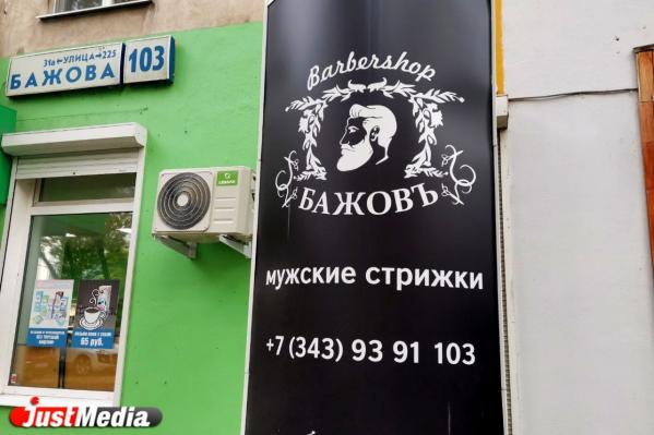 На Бажова,103 на вывеске местного барбершопа «Бажовъ» можно увидеть, как бы выглядел Павел Петрович Бажов после посещения барбершопа.