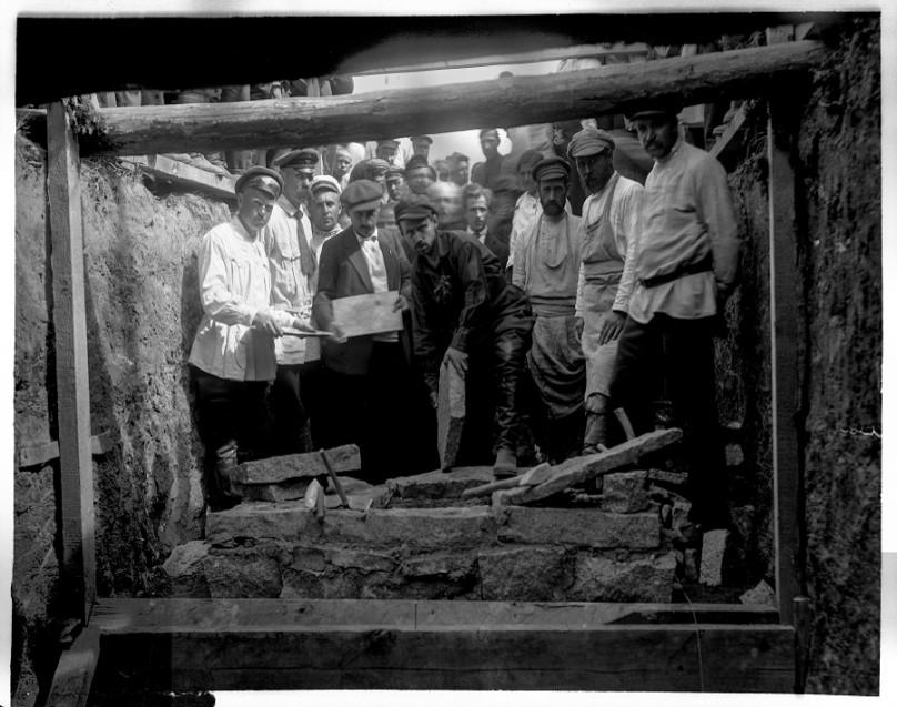 Оркестр играет Интернационал, а каменщики спускаются в котлован. На медную доску кладут первый камень и первый мазок цемента.