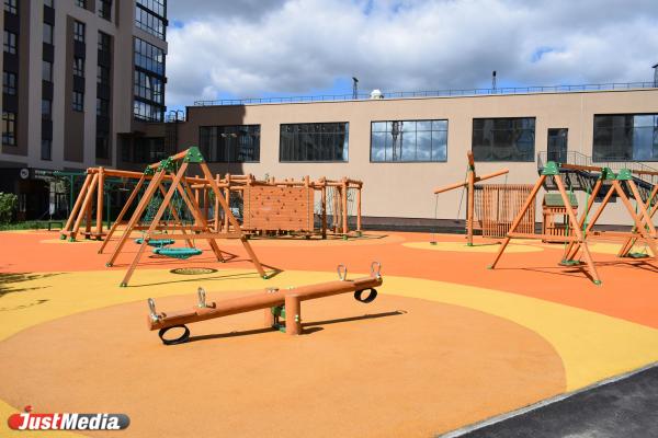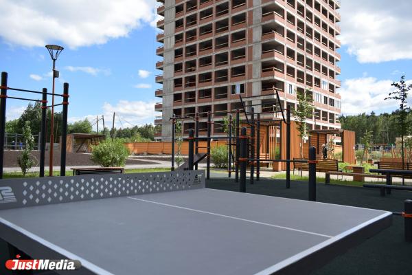 А дворы уже почти завершены – застройщику с управляющей компанией осталось только озеленить территорию. Детские площадки есть у каждого дома, и они разные. На одной главный материал - дерево, на другой прорезиненное покрытие, а на третьей - из камней. Посередине стоит и универсальная спортивная площадка. Все соединено дорожками, есть беседки, мусорки и даже раздается Wi-Fi. Есть чем заняться и взрослым – небольшая зона ворк-аут тут тоже присутствует.