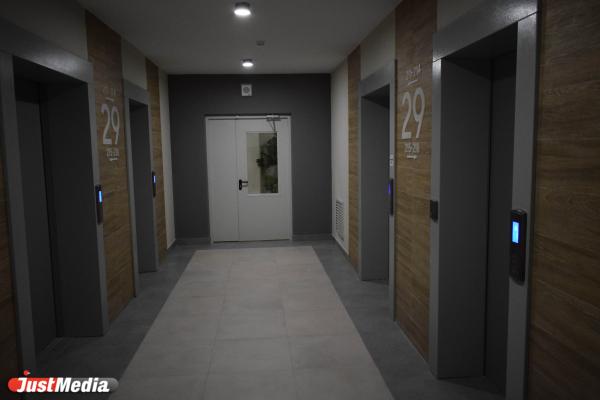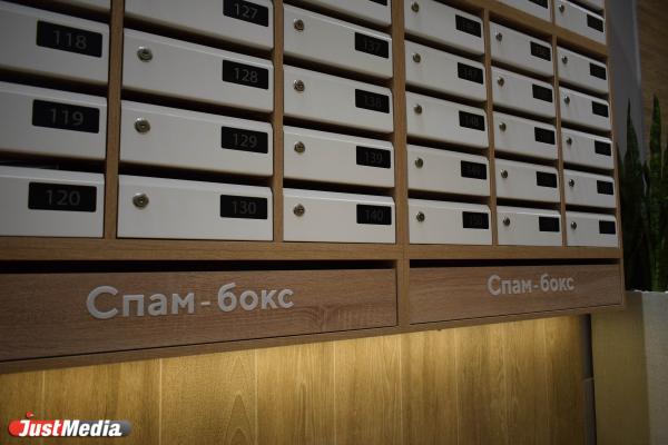 Сами дома разной этажности и, признаться честно, выглядят скучно. Может быть, слишком строго. Построенный на первом этапе дом вышел всего в 18 этажей, второго этапа состоит из трех высоток от 22 до 30 этажей. Заходим в самый высокий и обнаруживаем 4 лифта. Также с первого шага хочется отметить шикарные стеклянные двери, большой и светлый холл с качественной отделкой, наличие скамеек, зелени и даже общего санузла с комнатой для колясок. Под почтовыми ящиками есть спам-боксы, куда жители могут сбрасывать рекламу. Рядом находится комната охраны – в ней все серьезно.