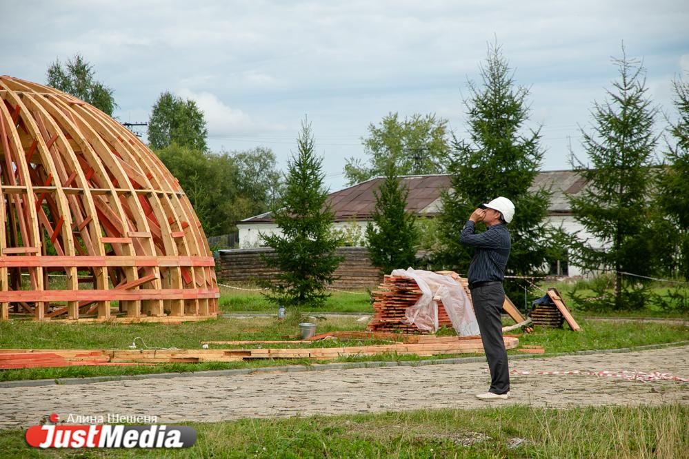 Вчера, 19 августа, 4 рабочих подняли на свод южного крыльца и восточной абсиды главного придела Кресто-Воздвиженского храма две четырехтонных полусферы. Прошлая конструкция, прослужившая 100 лет, уже просто сгнила. Для того, чтобы в этот раз дерево прослужило дольше, его обработали специальными противопожарными средствами и химическими веществами от вредителей – от этого оно приобрело красноватый оттенок.