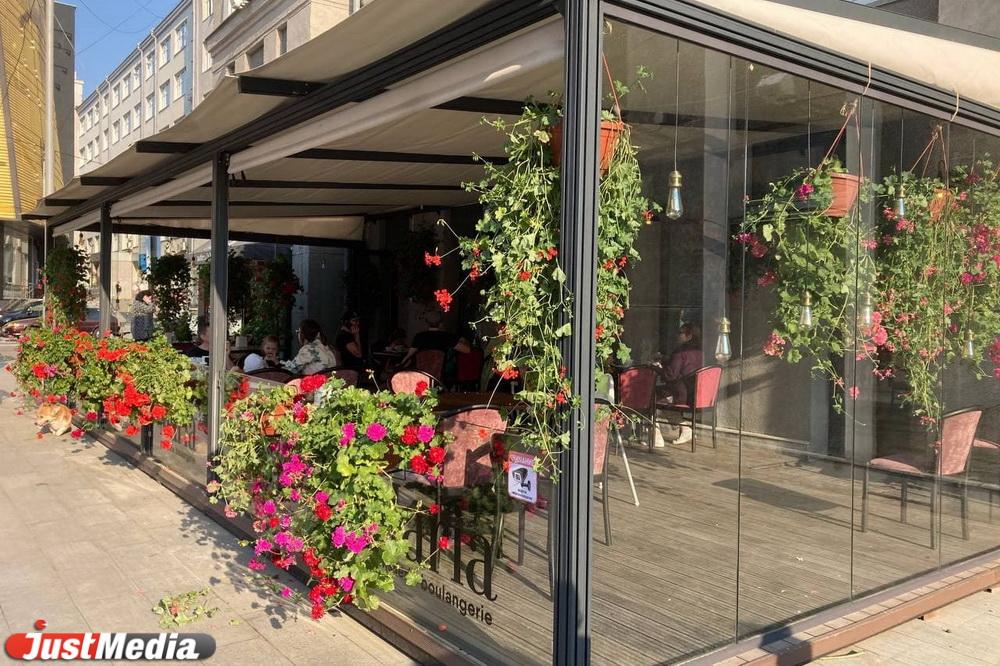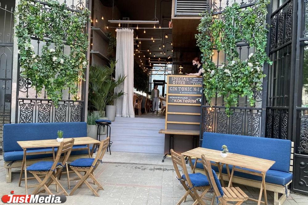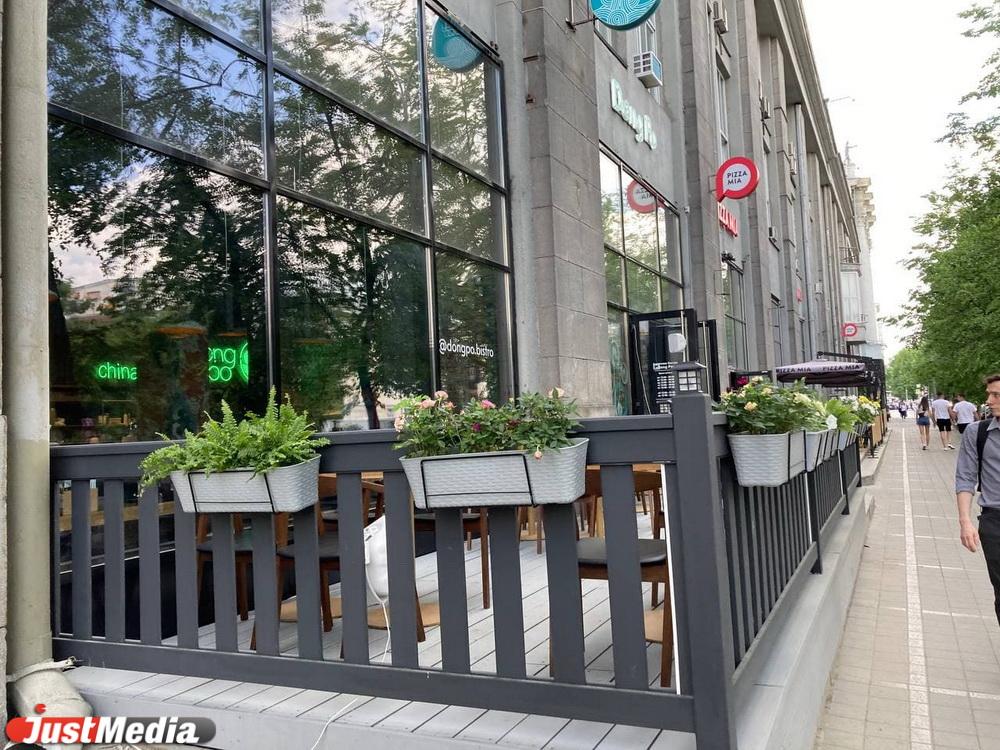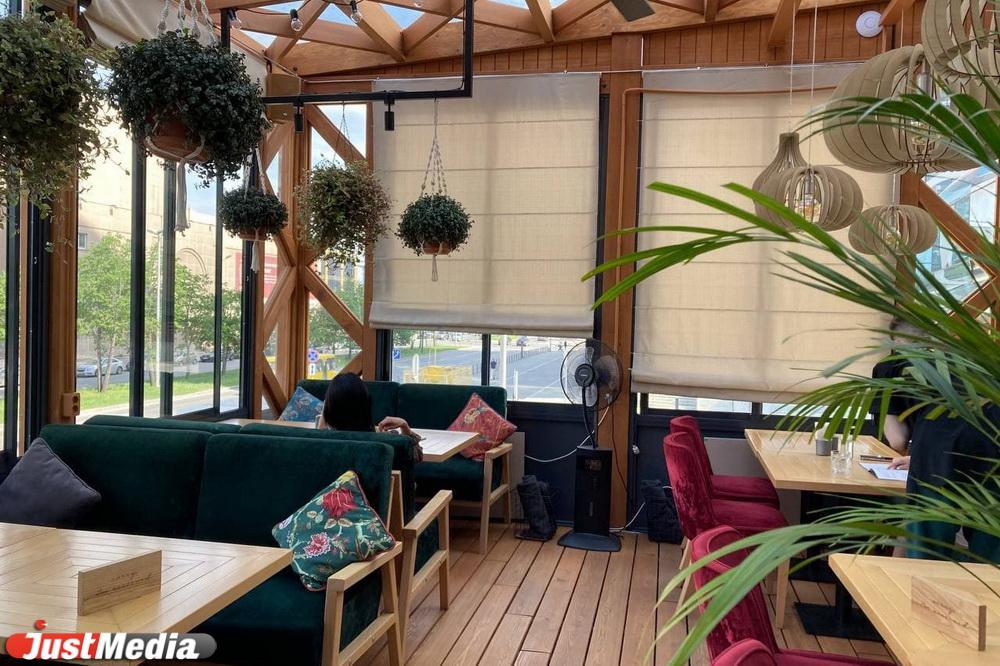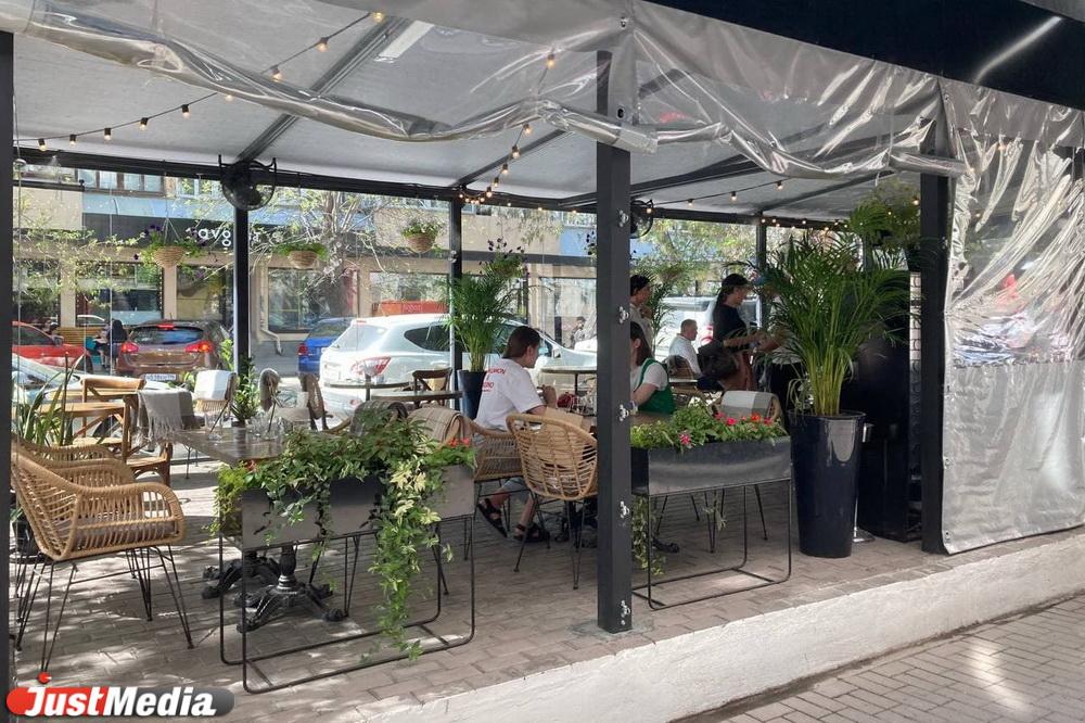 Следом идет большая и уютная веранда от Бюро находок. Как и в прошлом году, она уже установлена за рестораном, и скоро откроют летник со стороны Малышева. Зеленая и светлая, очень освежает своей атмосферой. Средний чек тут 1 500 рублей, меню радует европейской, итальянской и французской кухней. У них тоже есть завтраки, но с 10 утра (зато действуют весь день). Очень большое меню с десертами, советуем обратить внимание на манго. В бюро вкусная пицца и хорошие, разнообразные бизнес-ланчи.