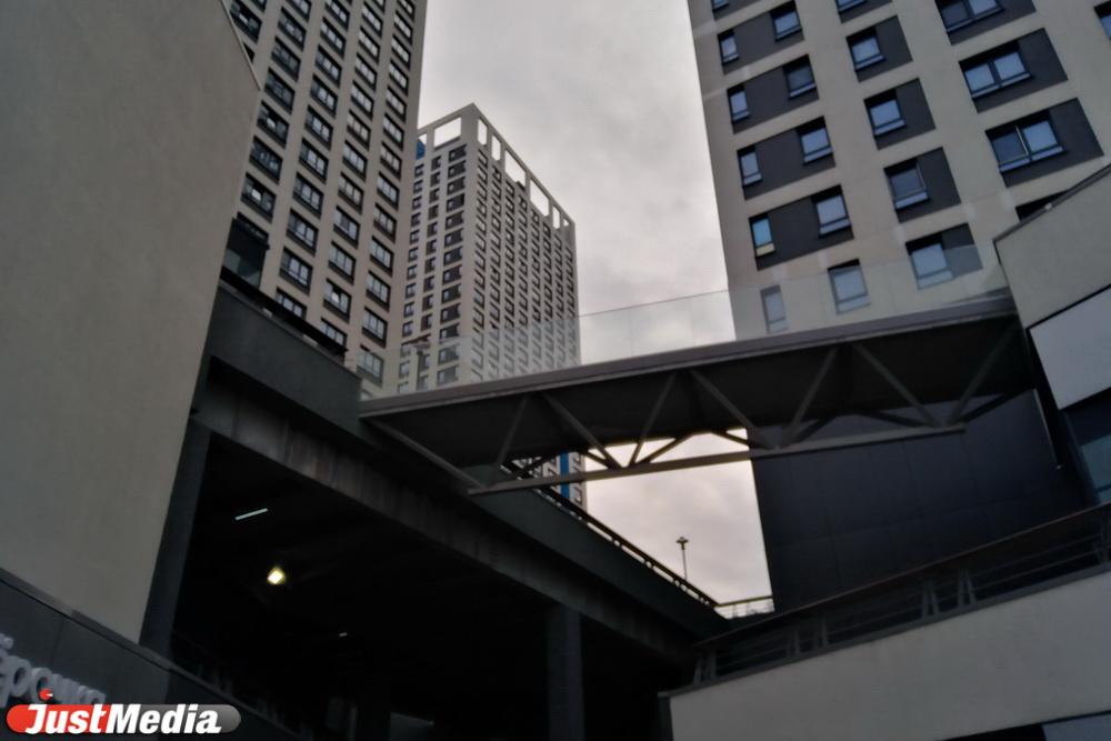 Между вторым и третьим корпусом расположена лестница, которая выводит на уровень двора и первых этажей. Двор, объединяющий корпуса, соединен мостиками, а вход в него, как и в дом из магазинов, только по модному ключу. На территории установлено видеонаблюдение, доступ к нему есть у каждого жителя.