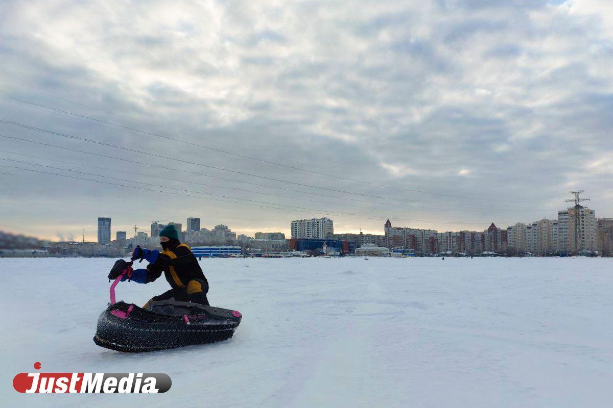 В этом году на Верх-Исетском пруду мало снега, поэтому прыгаем на снежных заносах и учимся амортизировать подскоки ногами, на поворотах балансируем телом. Через 20 минут таких покатушек ощущается заметное напряжение в руках и ногах, становится понятно, что прогулка на мотоборде – это еще и отличная физическая тренировка на все группы мышц.