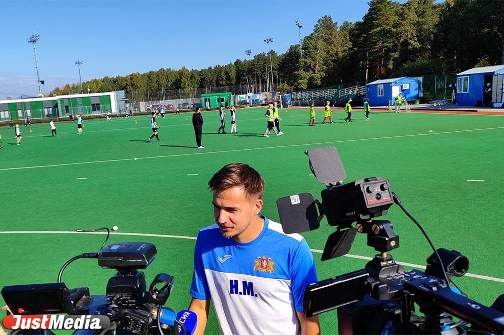 Пока дети отрабатывают пас, их тренер Николай Мележкин кратко объясняет, что такое хоккей на траве: