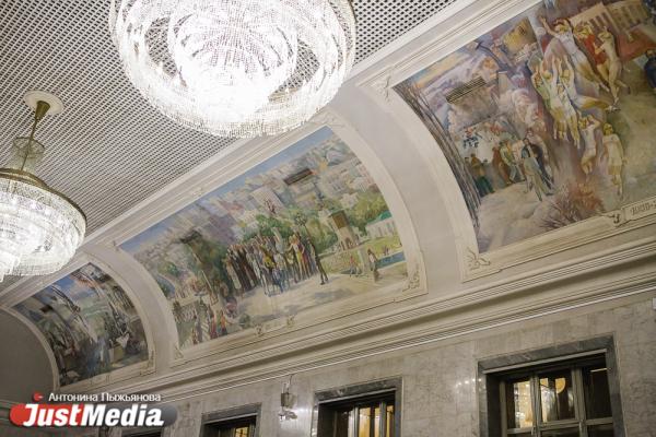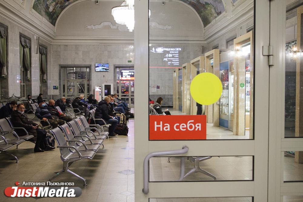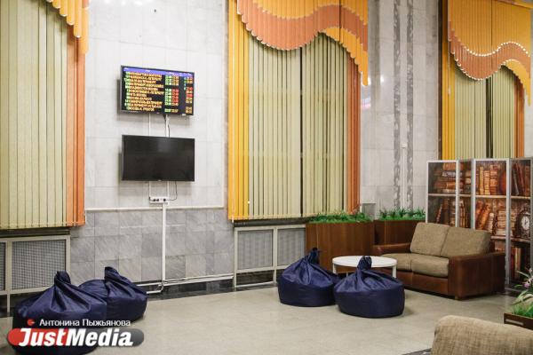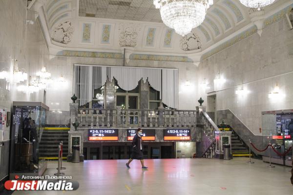 Наш разговор прерывает мужчина – ему срочно нужно отправить посылку в Ульяновск. Сотрудница принимает пакет и сообщает, что через пару дней он уже прибудет в место назначения. Всего, по ее словам, за ночь приходится принимать более десятка отправлений. Мы идем дальше – в зал ожидания. По пути я смотрю наверх и замечаю, что потолки расписаны – они поделены на сектора, каждый из которых рассказывает о знаковых событиях истории Урала. Приметы времени – экраны, на которых крутятся видеоролики о мерах профилактики новой опасной инфекции – COVID-19. Кроме того, почти во всех помещениях вокзала развешаны бесконтактные санитайзеры. А большинство посетителей – в медицинских масках.