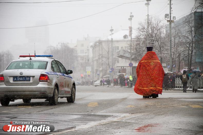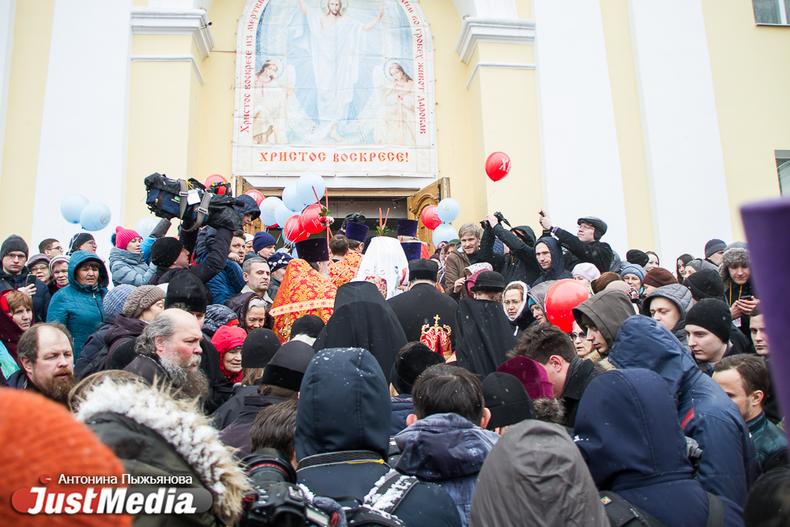 После встречи благодатного огня люди прошли от собора на улице Розы Люксембург,57 к Октябрьской площади — месту, где планируется построить храм Святой Екатерины. Многие взяли с собой термосы с горячим чаем и зонтики, чтобы укрыться от метели и сильно не замерзнуть по дороге. Весь путь верующие выкрикивали православное приветствие «Христос Воскресе». В крестном ходе поучаствовал и глава региона Евгений Куйвашев, рядом с ним шли полпред президента РФ Николай Цуканов и олигарх Андрей Козицын. С последним губернатор общался активнее.