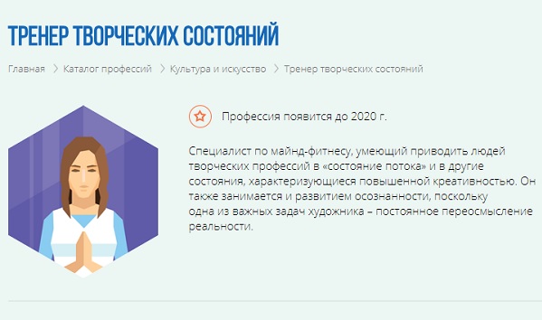 Тренер творческих состояний - профессия раздела «Культура и искусства» из «Атласа новых профессий». Описание ее довольно размытое, однако в списке перспективных направлений сказано, что «специалист по майнд-фитнесу» появится до 2020 года. Такой тренер будет обладать знаниями и навыками того, как сознательно провоцировать в себе «состояние потока».