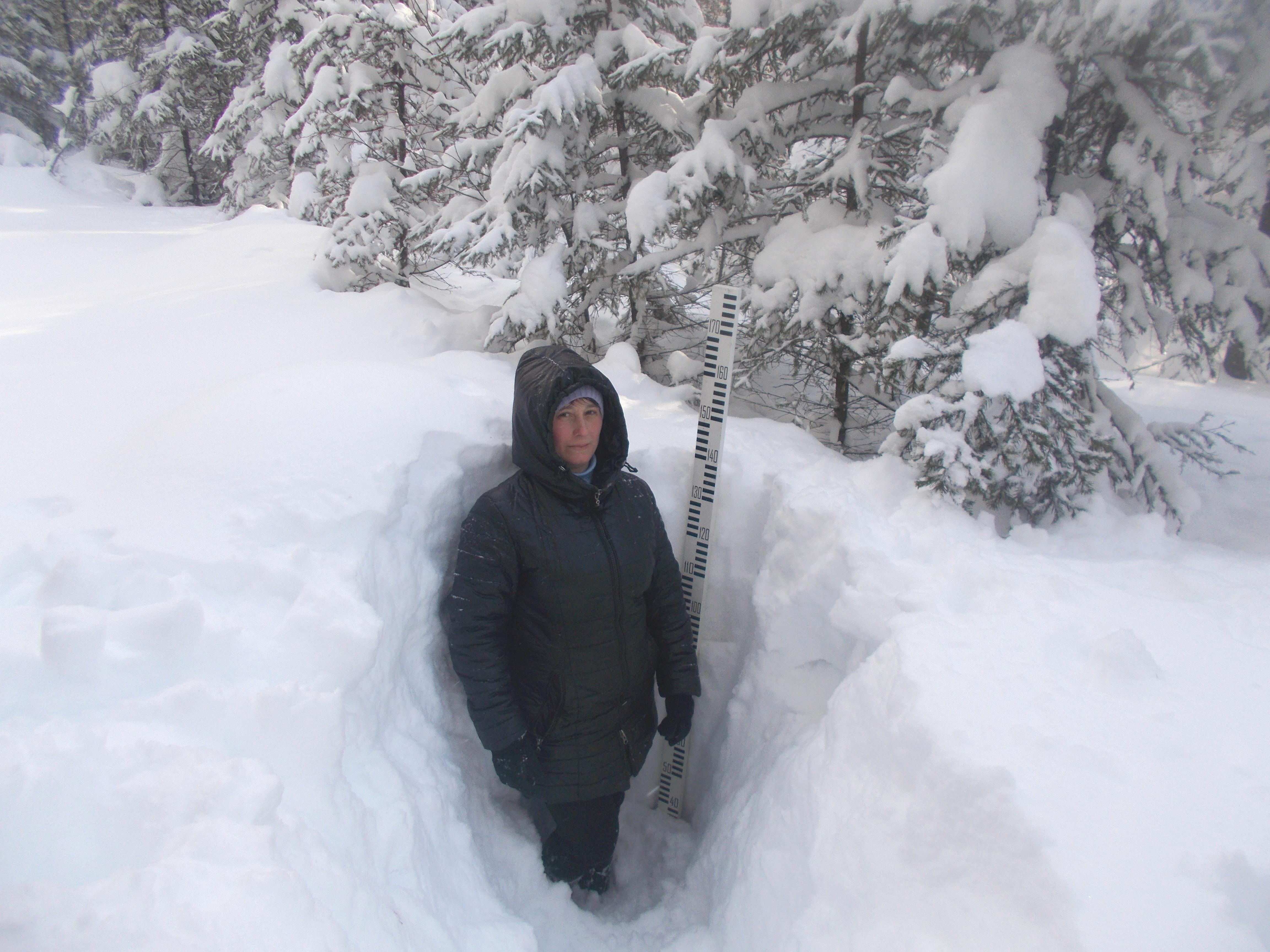 | Наблюдатель метеостанции Кытлым на снегомерном маршруте, март 2016 года |