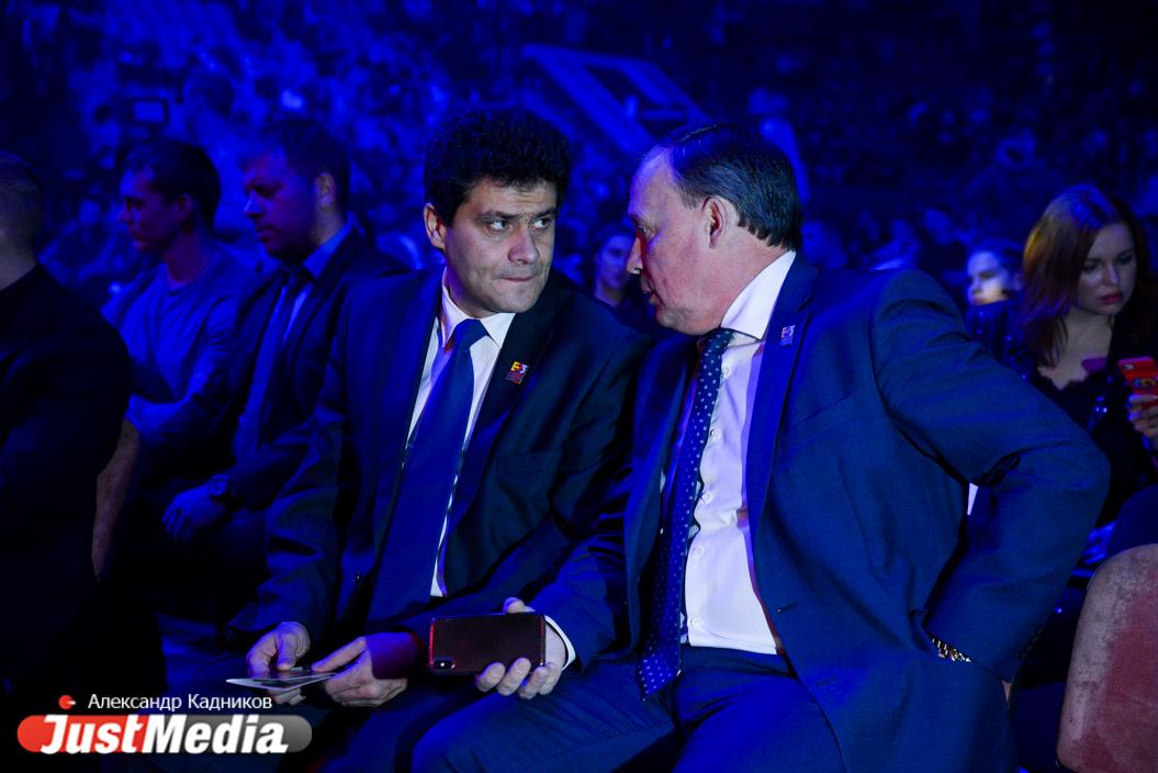 Первыми чиновниками, которые вышли на сцену, стали сенатор Совфеда Аркадий Чернецкий и глава Екатеринбурга Александр Высокинский. Они наградили лучший бизнес-центр года. Оба пришли в пиджаках, на лацканы которых прикрепили значки в поддержку заявки Екатеринбурга на ЭКСПО-2025. Ведущая Джулия Игнатова решила встать между двумя мэрами столицы Урала — бывшим (Аркадием Чернецким) и нынешним (Александром Высокинским), чтобы загадать желание.