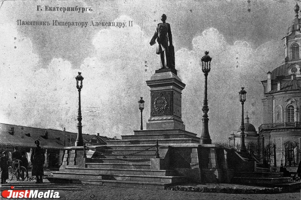 Тогда гордума решила поставить на площади копию памятника Александру II, установленного в Екатерининском зале Московского окружного суда. В 1900 году екатеринбуржцы выкупили у вдовы скульптора М. П. Попова право на повторную отливку. Однако к 1903 году памятник был не готов, на площади в районе пересечения Ленина и 8 Марта установили только мраморный постамент, на котором была надпись: «Царю Освободителю в память о 19 февраля 1861 года от городского общества и горнозаводских мастеровых. Осени себя крестным знаменем, православный народ, и призови с нами Божие благословение на твой свободный труд».
