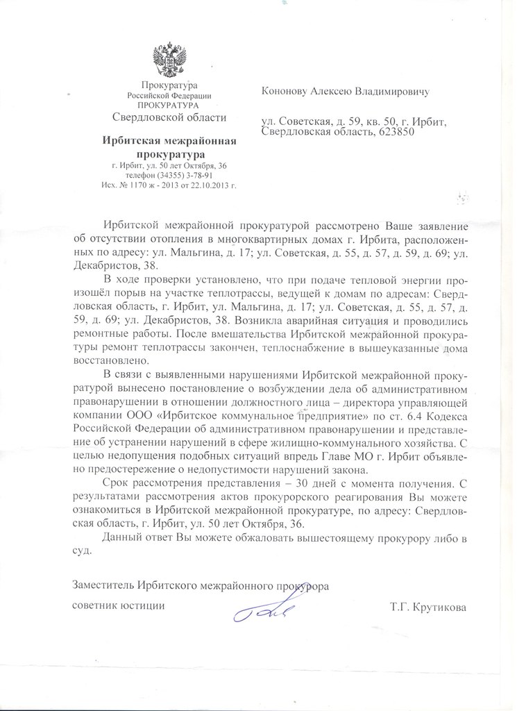 Горожане, уставшие терпеть холод в домах, написали обращения Президенту РФ, Генеральному прокурору РФ и в Ирбитскую межрайонную прокуратуру. Последняя инстанция по итогам проведенной проверки установила, что при подаче тепловой энергии произошел прорыв на указанном участке теплотрассы. В связи с выявленными нарушениями прокуратурой было вынесено постановление о возбуждении дела об административном правонарушении.