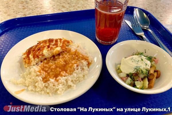Второй стала самая рейтинговая в Яндексе столовая «На Лукиных» на улице Лукиных,1 (Уралмаш). Столовая большая и очень классическая на вид, желтые стены, пол в клеточку, телевизор на стене для скрашивания трапезы. Мы приехали уже ближе к закрытию, и выбор блюд был минимальный, но в меню много интересного, чего попробовать не удалось, например, говядина с черносливом или жаркое по-домашнему. Нам достался на выбор рис или макароны (взяли рис - 28₽), и порция куриного филе «Полянка» (95₽). Решили попробовать домашний салат с маринованными опятами (40₽) и, конечно, компот. Здесь он клубничный - достаточно вкусный, но сахара слишком много. Рисом в столовой не удивить, он обычный, а вот курица неплоха, филе не сухое, сверху майонезная шапочка с помидорами. Вот правда майонез тут уж очень любят, он почти во всех салатах и во многих блюдах. Место приличное, поесть можно очень дешево и при этом нормально, главное приходить пораньше. Также есть своя выпечка. Наш обед обошелся в 169₽.