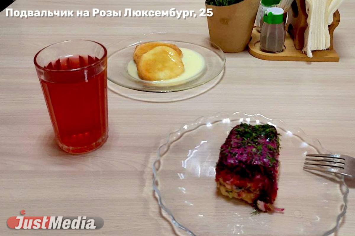 Следом заглянули в «Подвальчик» на Розы Люксембург, 25 - столовая малоизвестная, но здесь всегда очень вкусно и по-домашнему накормят. Повара приветливые и душевные, наш корреспондент бывала тут два года назад, а ее узнали и встретили, словно вчера заглядывала. Мы взяли сырники (60₽) и селедку под шубой (40₽). Салат свежий, сразу почему-то напомнил о новогодних семейных праздниках. Сырники - лучшие из всех, что встречались в кафе, можно сравнить только с мамиными. Здесь всегда есть интересные «нестоловские» блюда с изюминкой - например, если чечевица, то с авторским соусом, или добавлением «беби-кукурузы» к овощам гриль. К чаю, как правило, бывают блинчики или выпечка. Само помещение небольшое, но уютное благодаря милым картинам на стенах (картины периодически меняются).